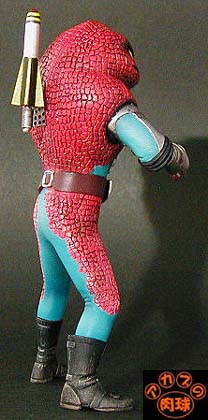 まず本体ですが、影などで暗くなると思われる部分に@を吹き、その後、タイツ部にグラデになるようにA、Bを 塗装。目にはAを塗装。マスキング後、ブーツを@で塗装。さらにマスキングしてウロコ部にグラデになるように C、Dを塗装。そしてさらにマスキングして金属部にFを塗装し、質感アップを狙って薄めのGを軽く吹き付けました。 ウロコ部にはLをウォッシング塗装し、目の周りは薄めず原液のまま塗り付けました。 下半身のウロコ部にはNをドライブラシでアクセントをつけました。 仕上げにブーツをメインに全身の汚れていそうなところにPでドロ汚れの表現をしてみました。 ミサイルは下地に@を吹きつけFを塗装。その後@、H、Iを筆塗りし完成・・・と思ったんですが、 背中のミサイルのほうは、資料(大百科)ではメッキのような感じだったので、Fとは違う表現を と思ってJを塗装しました。これで塗装完了!! ウロコとタイツの質感の違いにこだわってみましたがいかがでしょうか? クリアー塗料を使ったのでちょっと明るい仕上がりになりましたがmine的にはO.Kです!! |