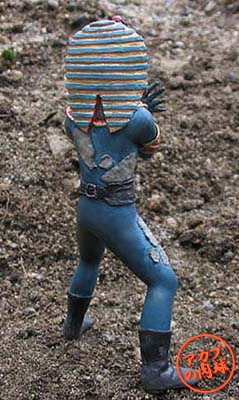 まず、影となると思われる部分にカラーDを吹き、その後、グラデになるように@、Aを吹き付けましたが、 綺麗になりすぎてしまったので、筆塗りに変更しました。と言うことで今回はほとんど筆塗りとなりました。 頭部、肩部、腕輪の金色部はそのままではあまりにも輝きすぎだったので シンナーでシャバシャバにしたGをさっと塗ってみました。 顔、胴体斑紋は最初エナメルのゴールドリーフでドライブラシしましたが、 変な感じになったのでゴールドを拭き取ってGをドライブラシ塗装しました。 仕上げにブーツをメインに全身の汚れていそうなところにIでドロ汚れの表現をしてみました。 ちょっと汚い感じの出来になってしまいましたが、mine的にはO.Kかなって思ってます!! この手の怪人はやや汚いくらいの方がいいっすよね!? |