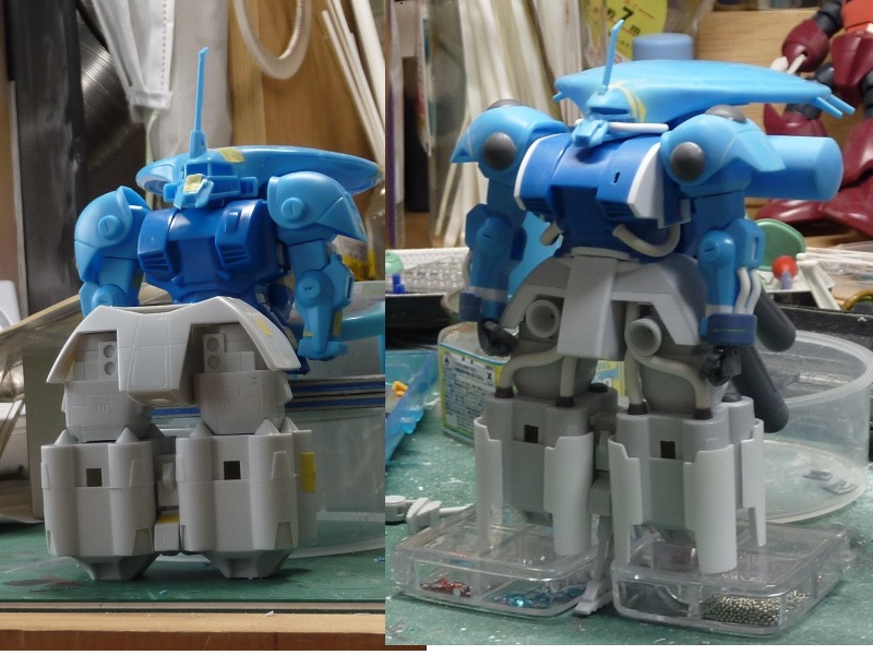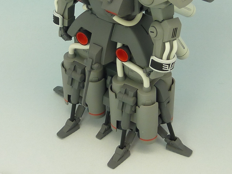 脚部) 太腿と股間の接続部分で3o延長。両足が末広がりになるよう股で2o、脛で3o開いてます。足が長く見えるようバーニアにカバーを付けました。