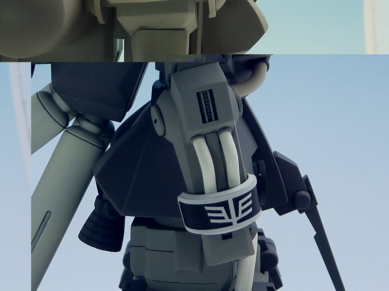 腕部) 上腕は前後左右0.5oずつ幅詰め、肘はガワラ曲げ、前腕は3o延長。袖はHGUCズゴックの腕の一節を加工しました。