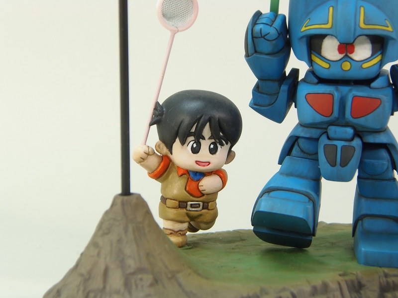ユウの右手に持つ虫取り網は削り取り真鍮線とプラパイプ、金属メッシュで製作といった感じです。