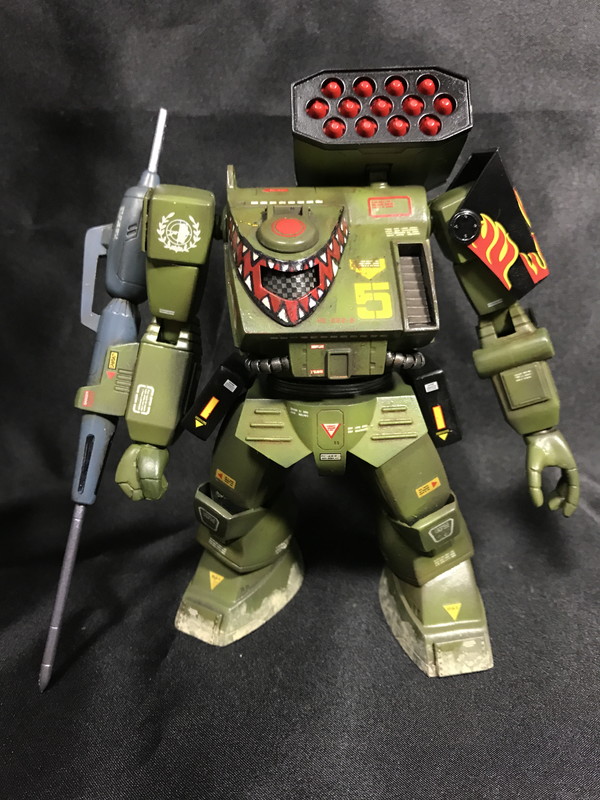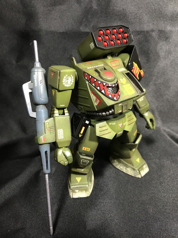 グリーンだけだと寂しいのでファイヤーパターンのデカールを肩に、シャークトゥースを筆塗りで頭部に追加しました。