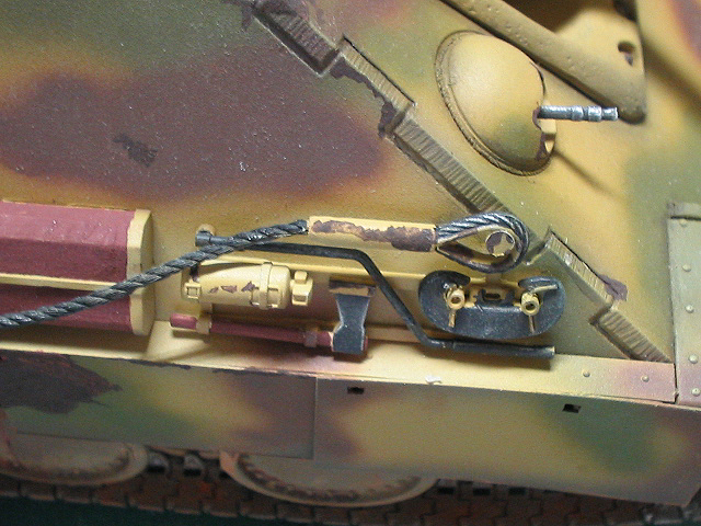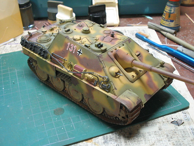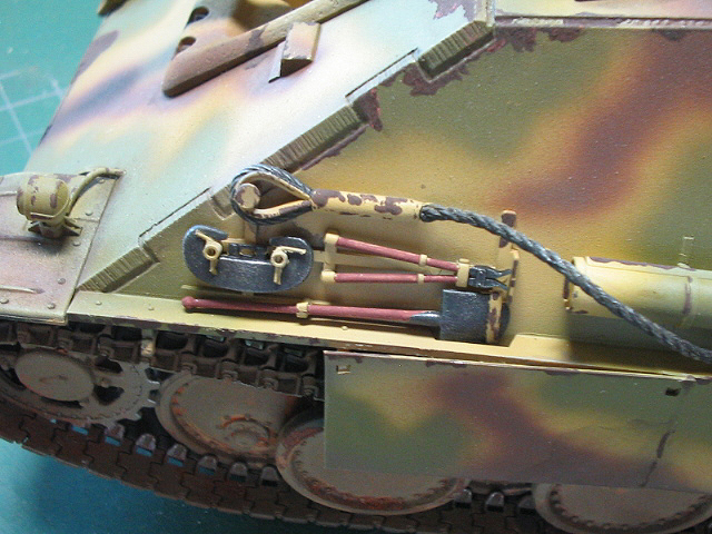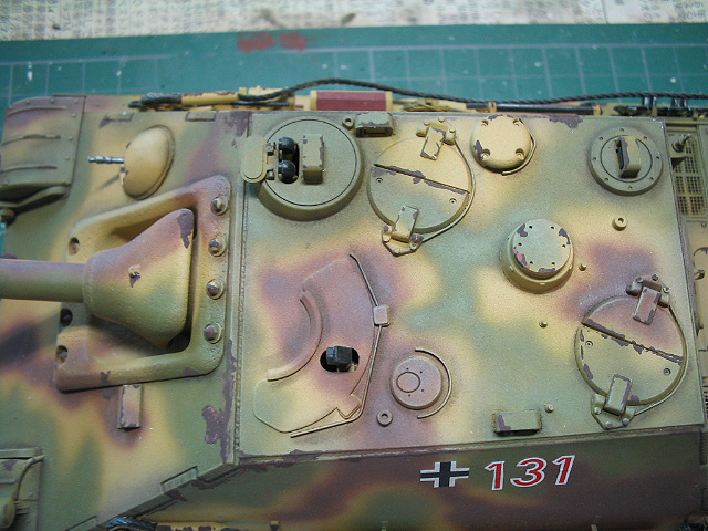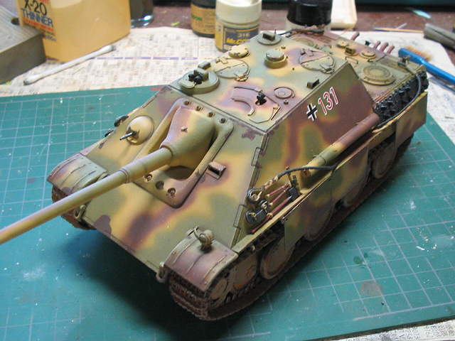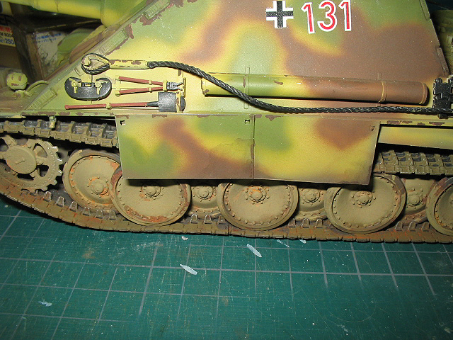 中心にドライブラシデカールを貼った後パステルをアクリル溶剤で溶いた物でOVMの木製部、マフラー、転輪を中心とした足回りを