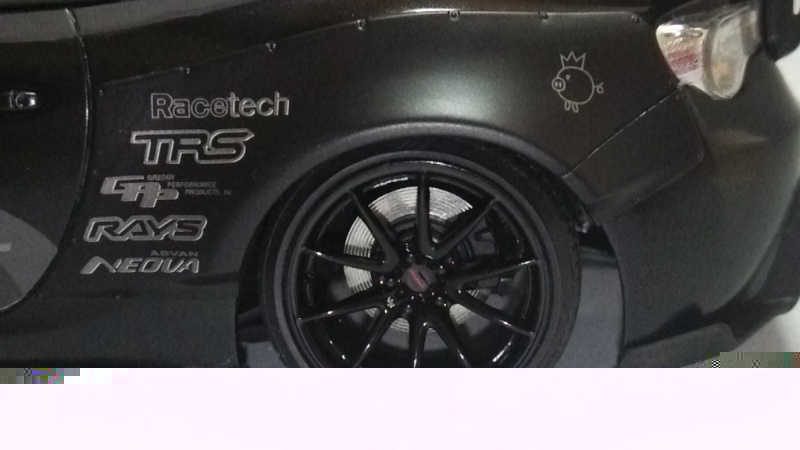 特徴的でド迫力のオーバーフェンダーを含め、エアロパーツはすべて黒サフのままデカールを貼り、ガイアのツヤ消しで仕上げました。