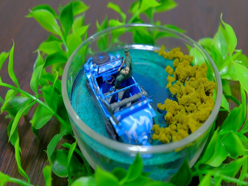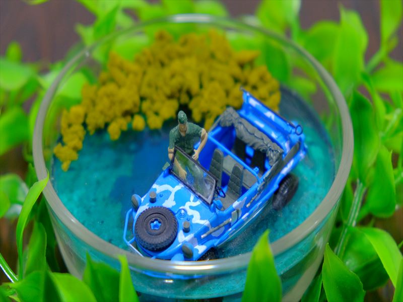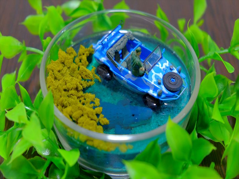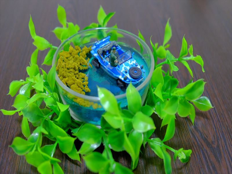 小さくてかわいいこの車両、水陸両用という特性を生かし、簡易ジオラマにしました。