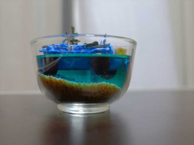 川の表現は、クリスタルレジンの流し込み。車両を浮かせるために2回に分けて制作。