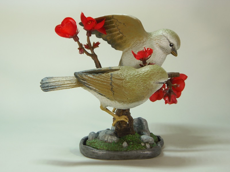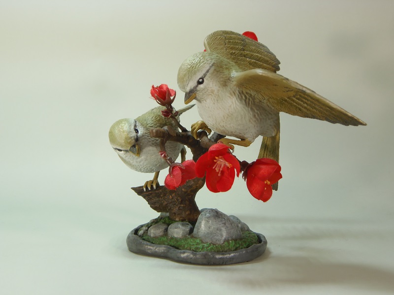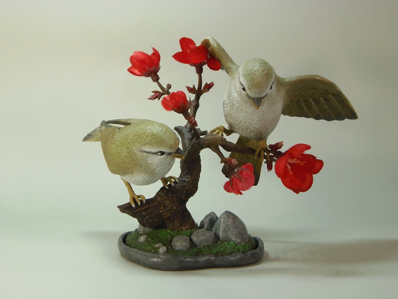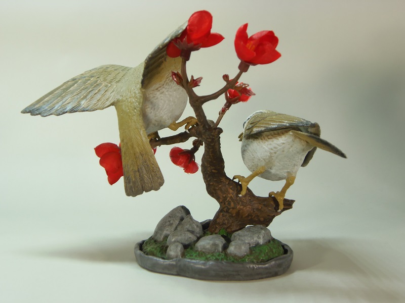 2、3候補を挙げた中で製作時が3月で時期的に丁度ドンピシャだったウグイスを選択し塗装、付属の小木は梅のミニ盆栽に見立て