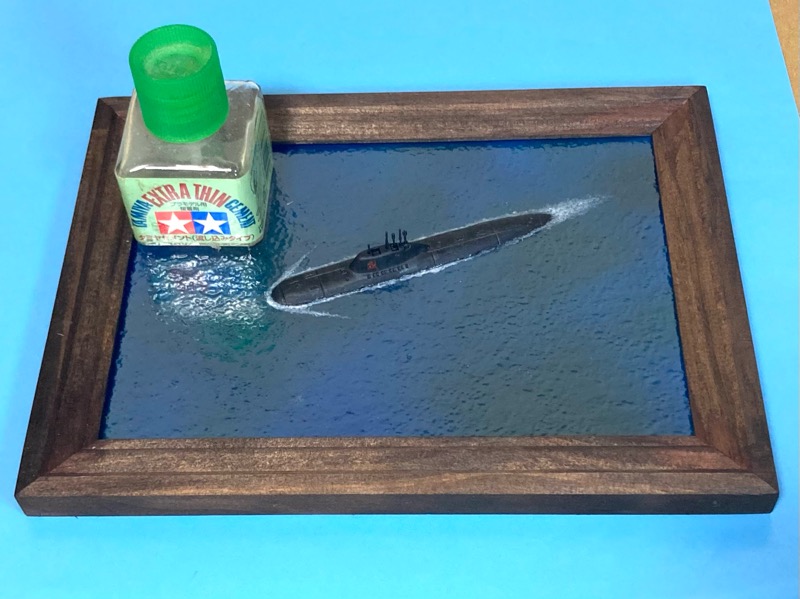 このベースに船体を固定、海面との隙間を100均のUVクリアレジンで埋めて、エナメルの白で波頭を描きました。